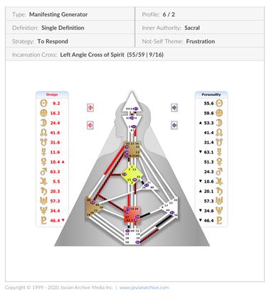 heeft een unieke blauwdruk (bodygraph of chart) gebaseerd op de geboortedatum, -tijd en –plaats. Zie