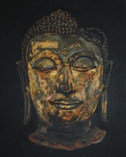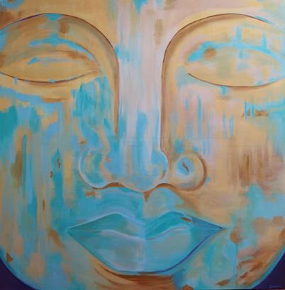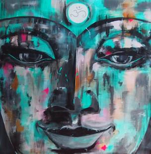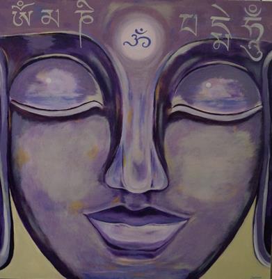 voorhoofd staat van links naar rechts de mantra ‘Om mani padme hum’